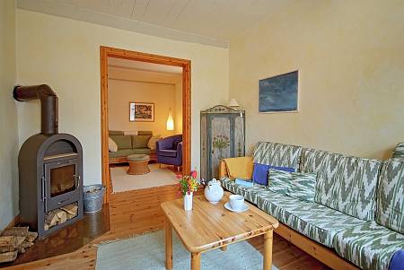 Vom Flur geht es nach rechts in die Stube.Im vorderen Teil mit Kaminofen und im hinteren Teil, dazwischen eine