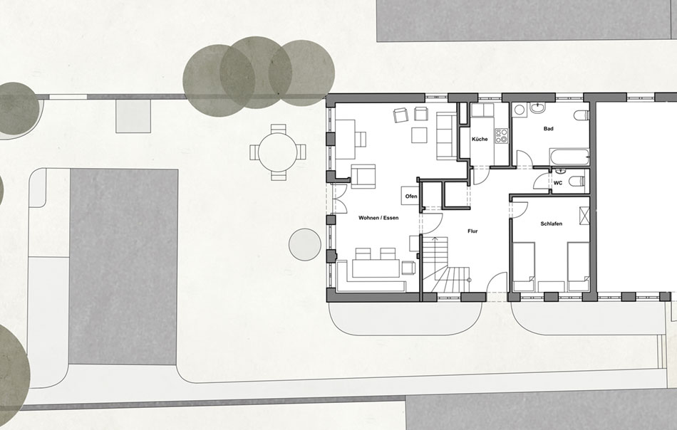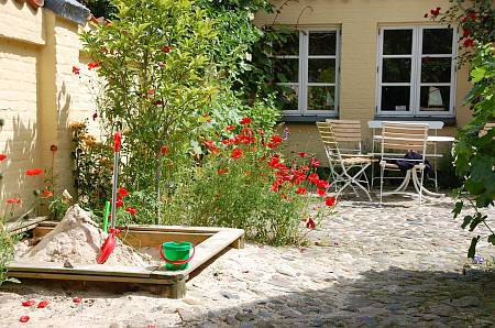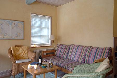 Die große Wohnstube unten hat eine Sitzecke mit Kaminofen. Der Fernseher ist etwas versteckt unter dem Schreibtisch und soll sich nicht so aufdrängen. Ein Plattenspieler mit vielen Langspielplatten weckt Erinnerungen, der CD Spieler wartet auf Ihre CDs. Die Essecke mit einem rustikalen Tisch, einer Bank und Stühlen für Groß und Klein lädt zum geselligen Schmausen ein. Aus der Wohnstube geht es durch die Terrassentür auf den geschützten gepflasterten Innenhof mit Sitzplatz, Sandkiste und anschließendem Garten.