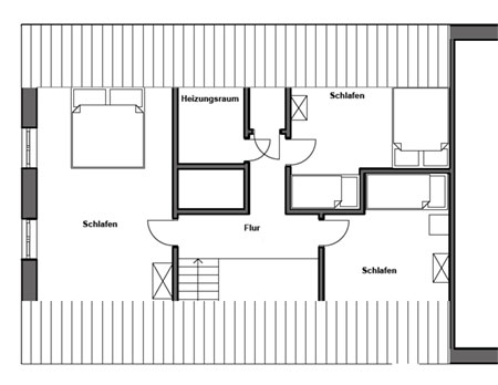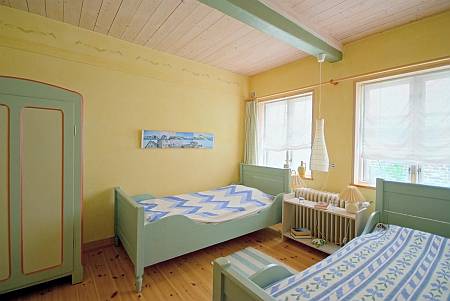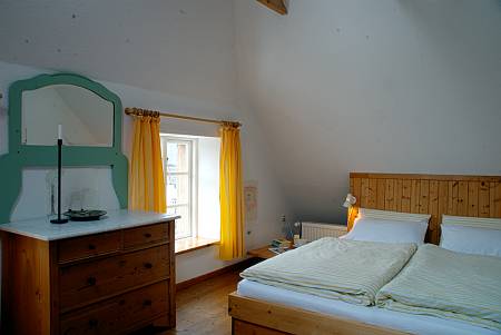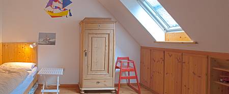 Oben sind drei Schlafräume: Ein großer Raum, bis zum First ausgebaut, mit Doppelbett, und zwei kleinere Räume; der eine mit einem Einzelbett, der andere mit einem französischen Doppelbett und einem Kinderbett. Für unsere kleinen Gäste steht ein Gitterbett bereit.