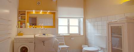 Unten von der Diele geht es in den Wohnbereich, die Küche, das Badezimmer mit Wanne, das