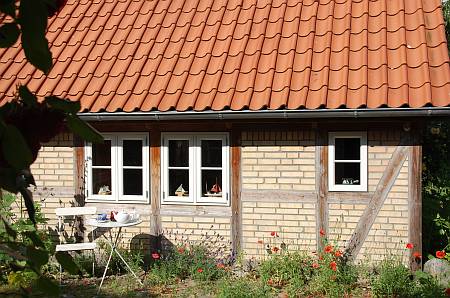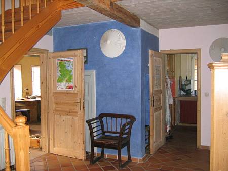 Zu der hinteren Ferienwohnung führt der Weg durch die rote Holztür mit den beiden Fischen, dann am Haus entlang bis zur Eingangstür. Das Haus hat zwei Ebenen: