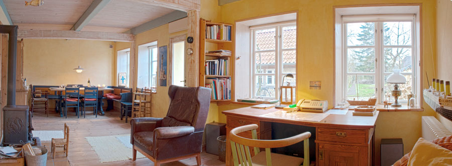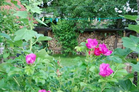 Hinten quer zum Haus steht der alte Stall, früher mit Schwein und Hühnern, der baufällig und Einsturz gefährdet war. Wir haben ihn abgerissen und so niedrig wie vorher wieder aufgebaut. Hinter der roten Tür, an der man sich so leicht den Kopf stößt, stehen Fahrräder, Gartenmöbel und ein Grill. Dort können auch mitgebrachte Räder abgestellt werden, soweit der Platz reicht.
